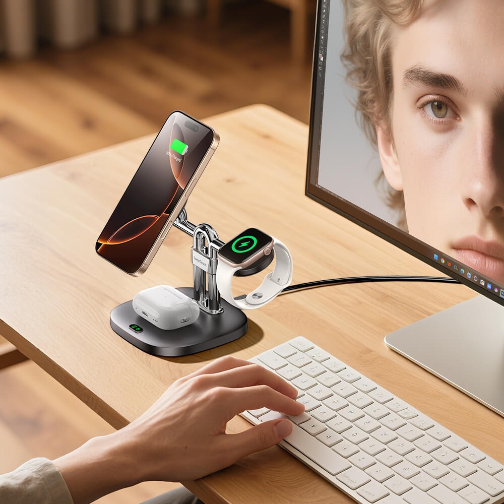 This product is also known as 3 in 1 Wireless Charger Stand for MagSafe, Magnetic Wireless Charging Station for Apple Devices, Charging Dock for iPhone, Airpods and Apple Watch. Regardless of the name, it reliably and efficiently charges Apple devices.