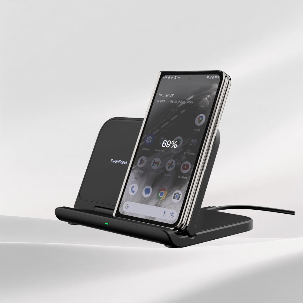 Les chargeurs sans fil pliables de SwanScout prennent généralement en charge deux modes de charge : en position verticale, le chargeur maintient le téléphone debout, ce qui est idéal pour regarder du contenu ou consulter des messages pendant la charge. Si la charge ne fonctionne pas, essayez d’ajuster l’angle de pliage pour mieux aligner la bobine avec celle de votre téléphone. Lorsqu’il est à plat, le chargeur peut alimenter des téléphones ou des écouteurs sans fil. Pour les écouteurs, alignez-les avec l’icône de bobine indiquée sur le tapis de charge pour un positionnement précis. Ce design flexible prend en charge diverses configurations d’appareils et améliore à la fois la commodité et la compatibilité.