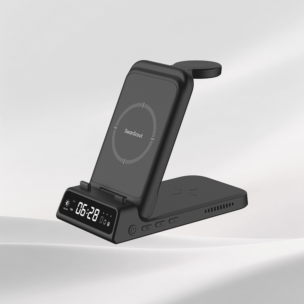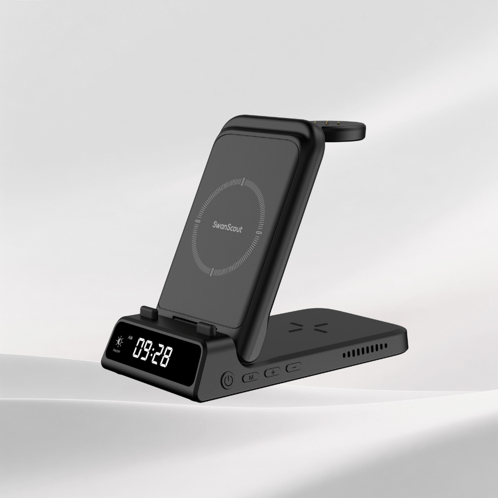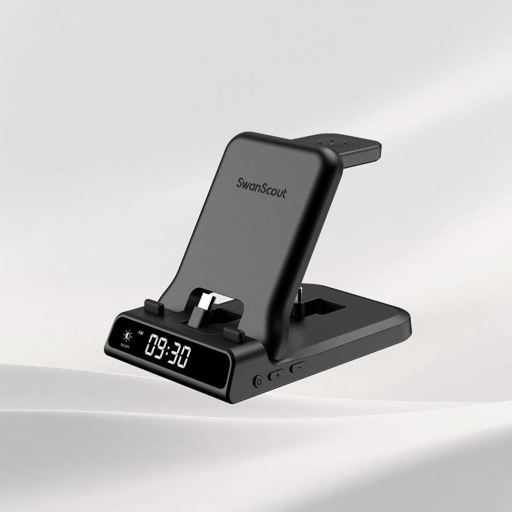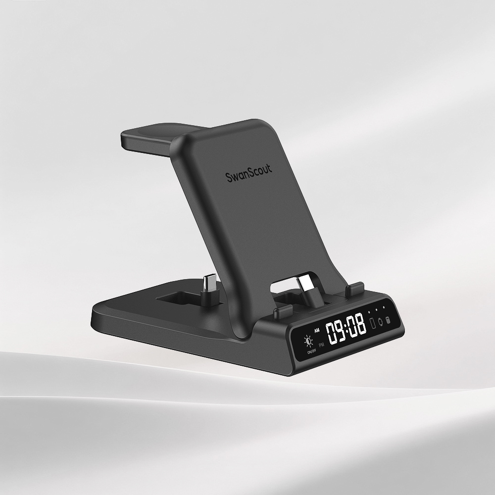 Los cargadores inalámbricos plegables de SwanScout suelen admitir dos modos de carga: Colocar el cargador en posición vertical para sostener el teléfono, lo que resulta ideal para ver contenido o revisar mensajes mientras se carga. Si la carga no funciona, intente ajustar el ángulo de plegado para alinear mejor la bobina con la de su teléfono. Cuando se coloca en posición plana, el cargador puede alimentar teléfonos o auriculares inalámbricos. En el caso de los auriculares, alinéelos con el icono de la bobina marcado en la base de carga para lograr una colocación precisa. Este diseño flexible admite diversas disposiciones de dispositivos y mejora tanto la comodidad como la compatibilidad.