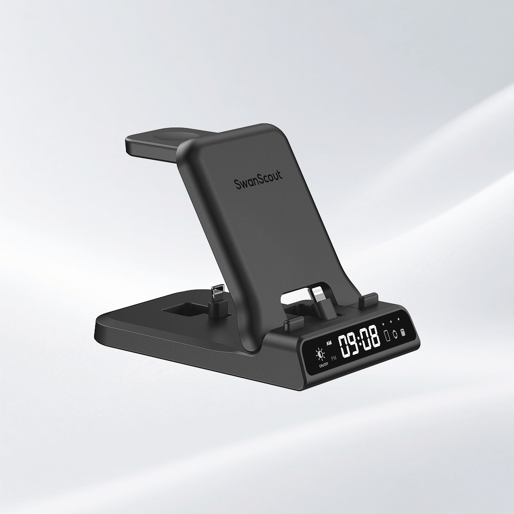 SwanScout 701A is a 3-in-1 wired fast charger compatible with Apple phones, watches, and earbuds, offering stable and efficient charging in one sleek unit.The swanscout 701A is a stylish alarm clock with cell phone charger, combining fast charging with a digital time display for added convenience.