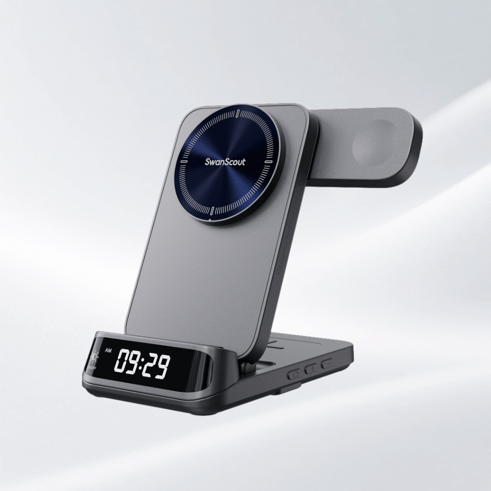 SwanScout 502M is a slim, 2-in-1 magnetic wireless charger compatible with Apple devices.The SwanScout 502M combines a sleek 2 in one clock phone charger design with an LED display and fast charging for daily convenience.