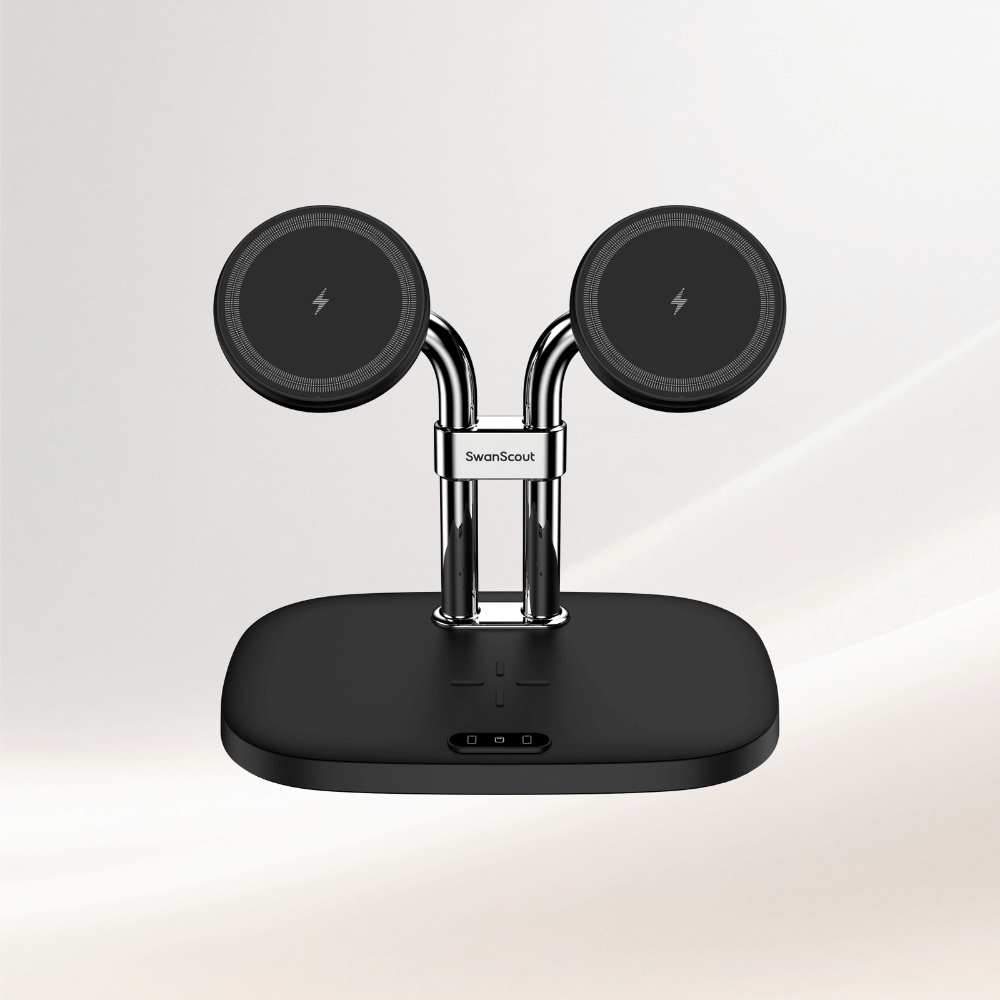 SwanScout 709M - 애플 기기를 위한 4-in-1 마그네틱 무선 충전기Elevate your setup with the SwanScout 709M, an elegant Apple Watch charger stand made for modern users.