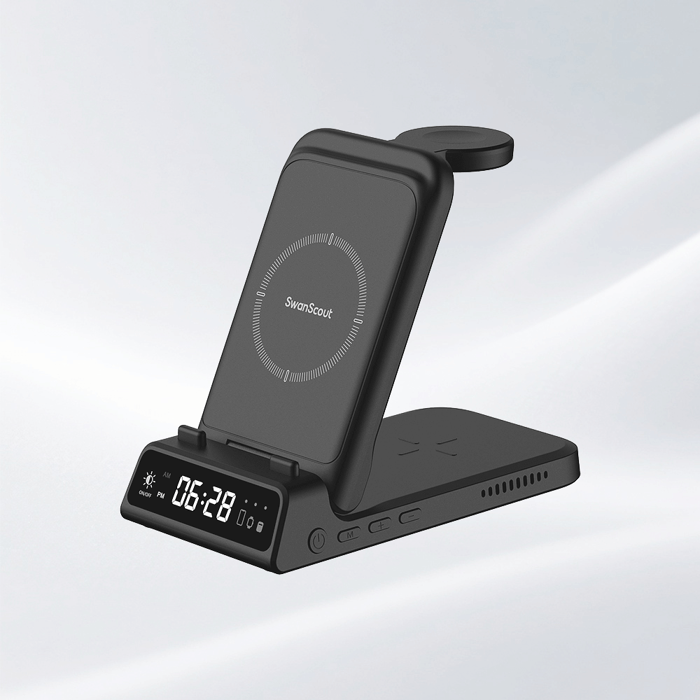 SwanScout 502M is a slim, 2-in-1 magnetic wireless charger compatible with Apple devices.The SwanScout 502M combines a sleek 2 in one clock phone charger design with an LED display and fast charging for daily convenience.