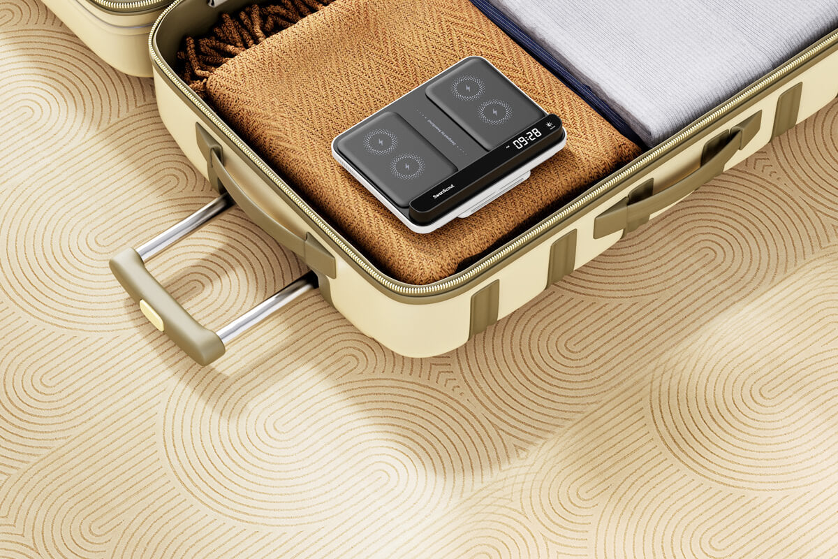 A portable wireless charger provides on-the-go power, perfect for travel or daily commutes without relying on outlets.